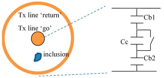 Modeling of PD events is an active research area. PD modeling is, frequently, performed mathematically, and this can be restrictive, not readily accounting for effects due to dispersive behavior of the power cable or multiple PD locations. PD models proposed in the literature can be classified into three main categories []: (i) the three-capacitance model []; (ii) the analytical based model proposed by Niemeyer []; and (iii) the finite element analysis (FEA) [] model. Each modeling method is characterized by its own strengths and weaknesses []. A well accepted model of PD is that the site of the discharge is treated as a capacitor, Cc, with a shorting switch (with further series capacitors, Cb1 and Cb2, representing the unaffected dielectric), as illustrated in Figure 1, where the middle capacitor with the shunt switch models the discharge site in a transmission (Tx in the figure) line.