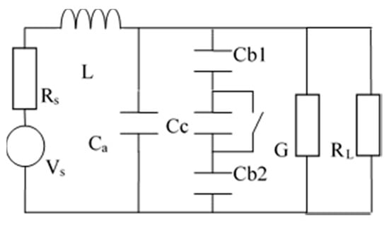 Here, a typical RLGC transmission line element is shown, where R and L are the series resistance and inductance of the line and G and C are the shunt conductance and capacitance. The capacitor term is replaced by a capacitance representing the bulk material (Ca) with the capacitance of the partial discharge site, such as a void, represented by a capacitor (Cc) in parallel with a switch. The closing of the switch represents the partial discharge event where the charge stored in the capacitor Cc neutralizes through a localized discharge. The “normal” dielectric, either side of the discharge site, is represented by two capacitors (Cb1 and Cb2). Vs and Rs represent a Thevenin source, and the transmission line is terminated in a load RL. There is a body of work that looks to calculate the value of Cc by analysis or simulation, e.g., [,,].