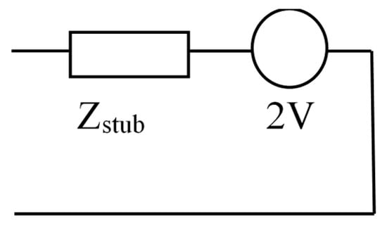 The voltage across the capacitor, Vstub, is given by Equation (3), where I is the current flowing through the stub, and V is the voltage source value (as shown in Figure 2). Assuming that the reflection coefficient, Г, at the end of the stub is +1 (−1 for an inductor), then the value of V for the next iteration is given by Equation (4):