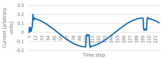 When implemented with a Δt of the order of one-tenth of a cycle and not many orders of magnitude lower, and a simple decision condition of triggering the event when the electric field across the central “PD” capacitor exceeded a certain level, the current flowing in the circuit can be seen in Figure 6. It is clear that such a circuit can help illustrate the behavior of a partial discharge event (even with such a crude decision strategy as was implemented here).