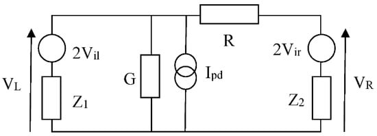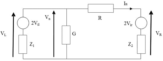 In Figure 9, Vn is the voltage node, VL and VR are the node voltage on the left and on the right of the node, respectively, In is the current at the node, R and G are the resistance and conductance of the node, respectively, Z1 and Z2 are the impedance of the line on the left and on the right of the node, respectively, and V1l and V1r are the voltages of the Thevenin equivalent circuit of the line on the left and on the right of the node, respectively. Applying Millman’s parallel generator theorem to Figure 9 enables the nodal voltage to be obtained from Equation (5); the potential difference on the left side can be obtained from Equation (6) with the right branch circulating current in Equation (7); and the righthand potential difference is given by Equation (8).