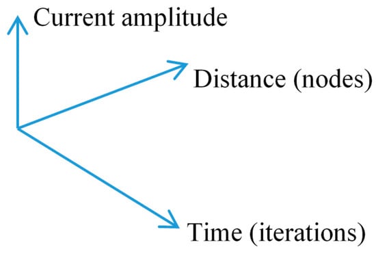 This is, essentially, a 2D view of the problem space. However, as explained before, there are benefits in considering the transmission line as a whole, because this allows questions to be asked and investigated. Such as: given that the PD will generate high frequency components and those may both radiate and propagate along a potentially frequency-dispersive transmission line, what effects are measurable? If this were to be undertaken analytically, there would be little scope for customization and asking questions, such as: how does the nature of the PD affect the measured effects?; or even: can the final measurements be time-reversed to understand the location and nature of the original problem? In the literature, few works exist that describe PD signal propagation on power networks [,,], but a full model that reproduces both the disturbance source (PD site), and the propagation of the generated disturbance has not been investigated.