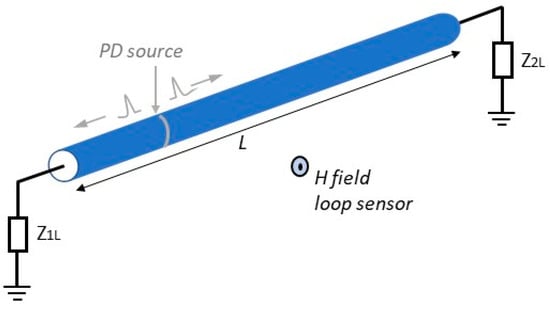 A line length of 100 m has been considered, with the PD source located 40 m from the left end of the cable. The line is formed by a medium voltage coaxial cable with cross-linked polyethylene (XLPE) insulation and a cross-sectional area of 150 mm2. The line is connected, at both ends, to two power transformers, with Z1L and Z2L impedance [].