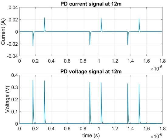 Figure 16 shows the PD voltage and current signals at 12 m from the left end of the cable. The figure shows the PD signal and its reflections from the cable ends and the attenuation of the signals due to the lossy line. The distortion effect, caused by the frequency dependence of the cable parameters, does not appear because it has not been reproduced in this first design of the simulation workbench under development.