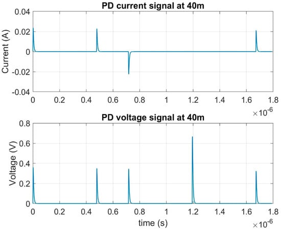 PD voltage and current pulses at the PD location, 40 m from the left end of the cable.