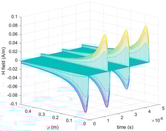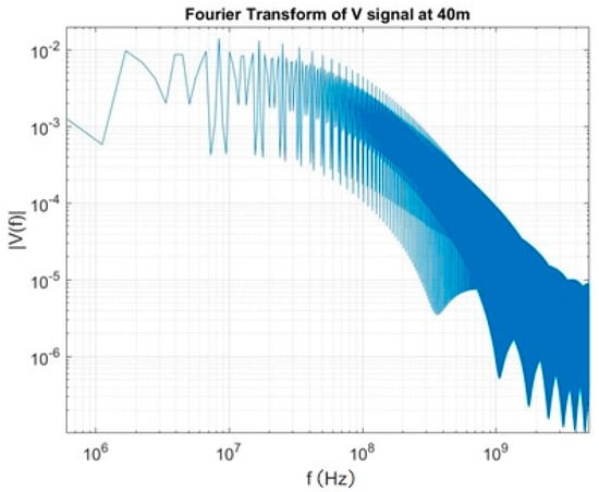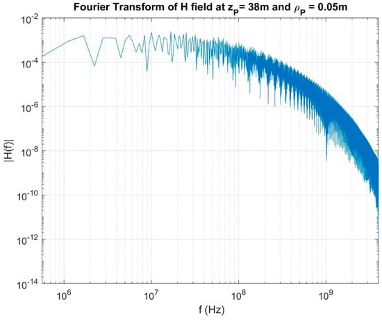 Figure 21 shows the Fourier transformation of the H field that describes its behavior in the frequency domain. As expected, Figure 21 shows that the PD radiated emission covers the UHF range. UHF sensors are, in fact, used to detect PD radiated emissions in substations [], then the ToA, time of arrival, method is used to locate PD sources.