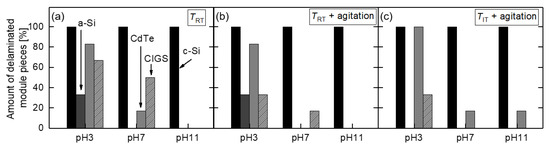 Amount of delaminated module pieces from crystalline silicon (c-Si), amorphous silicon (a-Si), cadmium telluride (CdTe), and copper indium gallium diselenide (CIGS) depending on the pH value of the water-based solution after 1.5 years for the three different experimental conditions: (a) , no agitation, (b) , with agitation, and (c) , with agitation.
