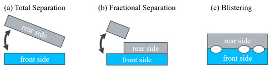 We classified all these delaminations into three different types: (i) Total separation: Here, the front side is clearly separated from the rear side. This delamination occurs in case of CdTe and a-Si module pieces. Figure 2a shows a scheme of this delamination type. (ii) Fractional separation: Here, only parts of the rear or front side are separated. The major part of the module compound is still intact. This type of delamination takes place for CIGS module pieces and for c-Si module pieces when leached in solutions with pH 11. The scheme is shown in Figure 2b. (iii) Blistering: Figure 2c shows this third type of delamination. Blistering occurs between either the front glass and the EVA foil, or between the EVA foil and the solar cell, but there is no complete separation. This type only occurs in c-Si module pieces.