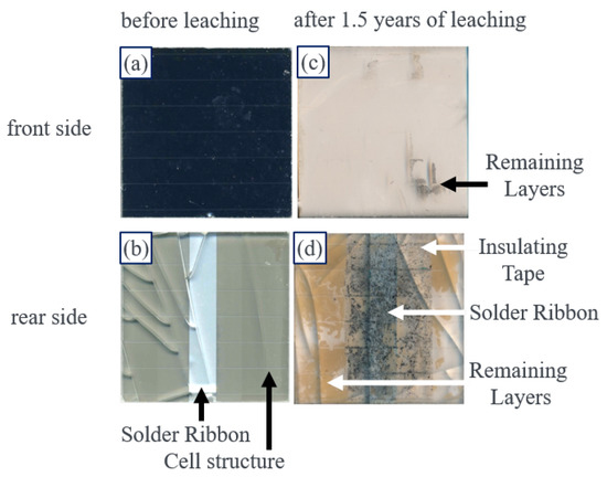 The present contribution gives answers to most of these questions via a long-term study. In contrast to previous work, our leaching tests are not only conducted over 24 h as requested by standard leaching tests [12,13,14,15], but for more than 1.5 year; some of our results are even taken after almost two years. Furthermore, we analyze not only eluted amounts of toxic substances like cadmium (Cd) and lead (Pb), but also other elements present in the module layers such as zinc (Zn), tellurium (Te), indium (In), gallium (Ga), selenium (Se), aluminum (Al), molybdenum (Mo), and copper (Cu), to identify soluble and, therefore, weak layers in PV modules. Parts of the experimental details were published earlier in German [16]; some results about the leaching of Cd, Te, and Pb up to day 360 were published earlier by us [10]. We find, that, finally, the modules delaminate because of the leaching from the edges of the module pieces. In all kinds of modules, at least one of the layers of the different cell types represents a weak path for the leaching. In the case of CdTe module pieces, the CdTe layer itself and the Mo contact are soluble. In the case of CIGS module pieces, the Zn front contact, the Mo back contact, and the Cd-containing buffer layer are susceptible to strong leaching. For crystalline silicon module pieces, the Al back contact is a weak spot; for amorphous silicon (a-Si) module pieces, also the back contact (Ni) and the intermediate layer containing Zn are identified as weak spots.