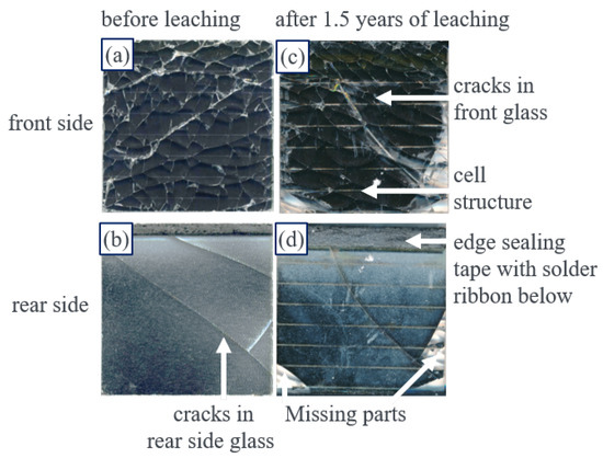 Total separation:Figure 3a–d shows photographs of the front and the rear side of a 5 × 5 cm CdTe module piece before and after 1.5 years of leaching. Before leaching the CdTe module piece, the integrated series connection of the cells is visible (see the horizontal lines) on the front side (Figure 3a) and also on the rear side (Figure 3b). On the rear side, one sees also the solder ribbon. Only the rear side glass of the module piece shows cracks caused by the water jet cutting. The breakage pattern of this glass indicates that heat-strengthened glass is used as the rear side glass. Figure 3c,d shows the front and the rear side of a CdTe module piece after the leaching process of 1.5 years in solutions with pH 3. Apart from a few parts, the module material disappeared completely. The solder ribbon is still attached to the rear side glass by an insulating tape. After this long-term leaching, the front and the rear side glasses are no longer connected to each other, but totally separated. For a-Si module pieces, the same type of delamination is observed.