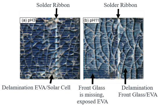 The combination of leaching experiments and the observation of delamination yields the following major insight: In the case of thin film modules (CdTe, CIGS, and a-Si), the delamination is the consequence of the high solubility of one or more thin layers of the modules’ cells. They form a path for the attack of the water-based solutions. In contrast, in the case of modules containing cells from crystalline silicon, the cell’s Al back contact is highly soluble, but not responsible for delamination. Instead, blistering occurs: delamination of c-Si modules is not visible on the back side, but on the front side, either between the front glass and EVA or between the EVA and the Si cell, depending on the pH of the leaching solution. Delamination between the front EVA and solar cell preferentially occurs around the solder ribbon on the front side of the cell and is therefore correlated with the leaching of Pb out of the solder ribbon. The backsheet on the rear side of the c-Si module piece shows no changes after the leaching. Unfortunately, the backsheet is not transparent; therefore, we do not have information about the condition of the solder ribbon on the back side and how the leaching of the Al back contact affects the leaching of the solder ribbon on the back. In solutions with pH 3, a local delamination takes place between the solar cell and the EVA foil, whereas in pH 11 solutions, the delamination occurs between front glass and EVA. In pH 7 solutions, we observe both kinds of delamination. The solution probably attacks the coupling agent. Therefore, in this case, we assume adhesion problems to be the main reason for blistering.