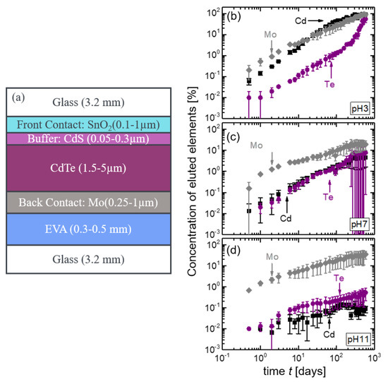 Figure 6d presents the leaching data for pH 11. Here, at the end of the experiment, the amount of eluted Mo is still high with . The measured concentration of Te is below 1% after 1.5 years, and the amount of leached Cd is the lowest. In solutions with pH 11, the time-dependent leaching rates of Cd and Te are much lower compared to the leaching rates in solutions with pH 7 and pH 3. For all conditions, the leaching rate of Mo is always higher than the one of Cd and Te. This indicates again that, in the case of CdTe modules, the Mo back contact is a weak spot.