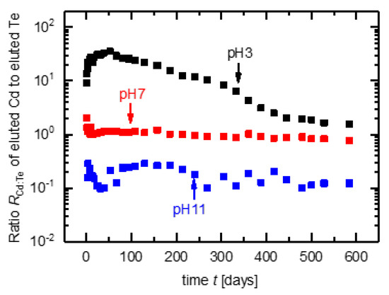 Figure 7 shows the ratio of dissolved Cd to dissolved Te from leaching CdTe module pieces in solutions with pH 3, pH 7, and pH 11. For leaching solutions with pH 3, the value of is not constant over the leaching time. At the beginning of leaching, is highest with 35:1, but with time, it approaches . For neutral solutions with pH 7, and is almost constant over time. The same behavior applies for leaching in alkaline solutions, but with . This means that more Te is dissolved in the solutions.