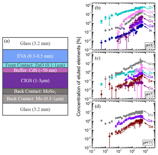 (a) Schematic structure of a typical CIGS module (not drawn to scale) and (b) time-dependent leaching results of the elements Zn, Cd, Mo, Cu, Ga, and In from CIGS module pieces in acidic aqueous solutions with pH 3 and (c) in solutions with pH 7 and (d) pH 11. In leaching solutions with pH 11, the concentrations of the elements Cd, Zn, Cu, and In are below the detection limit.