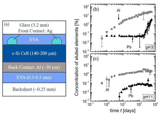 Figure 9a shows a schematic cross-section through a classic c-Si module, consisting of a front glass with EVA, a silver front contact grid with contact fingers and busbars, and the silicon solar cell with a screen printed aluminum back contact and screen printed Ag contact pads (not drawn in the scheme). In contrast to thin film modules, instead of a rear glass, most c-Si modules have a backsheet and a second EVA sheet at the rear side. Figure 9b,c shows the leaching data for Al and Pb for pH 3 and pH 11 (see also [10] for the leaching results of Pb until Day 360). In the case of pH 7, the concentrations of Al and Pb are below the detection limit, which is 500 g/L for Al and 20 g/L for Pb. The eluted Pb stems either from the solder ribbon, which is not shown in the schematic cross-section, or from the screen printed metallization. For pH 3, the amount of leached Pb remains constant and below 0.1% until Day 241. After this time, the concentration increases dramatically up to after 1.5 years. The concentration of Al reaches after 1.5 years in the acidic solution. In contrast, for the alkaline solution with pH 11, the concentrations of Al and Pb are significantly lower, as shown in Figure 9c. In both cases, the leaching rates of Al are orders of magnitude higher than the ones for Pb. Thus, in the case of c-Si module pieces, the Al contact, which is screen printed and fired into the back side, makes up the weak spot and opens the path for leaching.