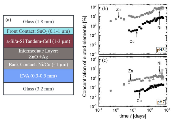 The common structure of an a-Si module is shown in Figure 10a. Amorphous silicon modules typically consist of a front glass with the front contact layer (SnO is mostly used), the photoactive p-i-n layer from a-Si, followed by an intermediate layer consisting of ZnO and Ag, the back contact with a combination of Ni and Cu, and the encapsulant with the rear glass [23]. Similar to the production of CdTe modules, a-Si modules are built in a superstrate configuration, starting with the deposition of the front contact directly on the front glass. Figure 10b,c shows the concentrations of eluted Zn, Cu, and Ni in the solutions with pH 3 and pH 7. Unfortunately, we do not have any data about Ni before Day 388 of leaching. In leaching solutions with pH 11, the concentrations of Zn, Cu, and Ni are below the detection limits. For the other pH-values, we are able to present data: Zn, which stems from the intermediate layer, shows strong leaching with concentrations up to after 1.5 years of leaching in the acidic pH 3 solution. The concentration of eluted Ni lies in the same range, whereas the concentration of Cu is . In aqueous solutions with pH 7, the elements Zn, Ni, and Cu leach only in minor amounts. The elements Zn, Cu, and Ni are leached out linearly with time, but with different rates depending on the element itself, as well as on the pH of the solution. In all cases, the leaching of the Zn is highest, and therefore, we identify the ZnO layer as a weak spot in a-Si module pieces.