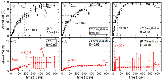Leaching of Cd from CdTe module pieces in solutions with pH 3 at (a) , (b) at with agitation, and (c) at with agitation. Eluted Cd in solutions with pH 7 at (d) , (e) at with agitation, and (f) at with agitation. The dotted lines represent the calculated fit according to Equation (2) with high coefficients of determination . The dashed lines show the calculated maximum concentration in the solutions.
