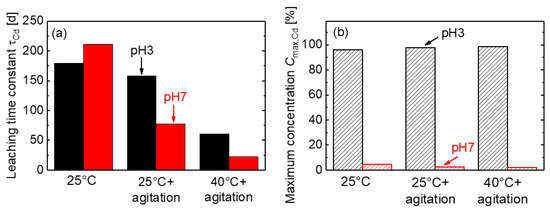 Figure 13a shows the leaching time constant for pH 3 and pH 7: A higher temperature results in faster leaching. In our study, is used, which is a common temperature PV modules reach when exposed to sunlight; on hot summer days, the temperatures are even higher. In solutions with pH 7, the change in the leaching time constant due to varied conditions is even stronger. In contrast to a different , Figure 13b shows that the maximum concentration of eluted Cd remains nearly constant and independent of modifications to the leaching conditions. However, the value highly depends on the pH of the leaching solution: it holds for pH 3 and for pH 7. The lower for pH 7 is explained by the formation of cadmium hydroxide in neutral solutions. This compound is not soluble and therefore not detected by our measurement method ICP-MS.