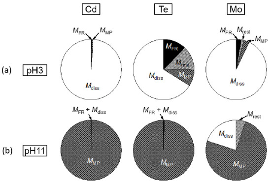 pH 11: Almost all Cd and Te still remain in the module pieces and are represented by the mass . Only in the case of Mo, a part of the Mo is measured in the solution as .