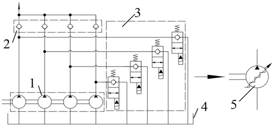 The configuration of the digital hydraulic system is shown in Figure 1. The main body includes the digital pump and control valve groups. The digital pump was composed of a plurality of gear pumps in coaxial series. The control valve groups were composed of a check valve group and an electromagnetic unloading valve group. The outlet of each gear pump is in parallel with a check valve and an electromagnetic unloading valve. When the electromagnetic unloading valve at the pump outlet loses power, the corresponding pump is connected to the system through the check valve, and the working state is “1”. Otherwise, the working status is “0”. By controlling the different combination states of the electromagnetic unloading valve to control the combination of hydraulic pumps participating in the working of the system to achieve digital change in displacement.