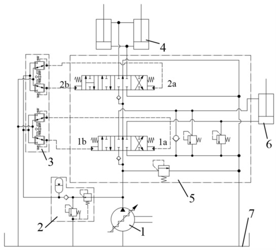 The digital hydraulic system is a new technology to obtain system variable output through real-time control of discrete hydraulic components [3]. Compared with traditional hydraulic variable control technology, the digital hydraulic system has the advantages of low cost, high response, easy control, high efficiency, and high reliability [4,5,6]. In recent years, it has been of wide interest to the hydraulic industry [7,8], and has gradually began to be applied to large equipment such as loaders [9] and excavators [10,11].The parallel digital hydraulic technology uses the logical combination of hydraulic components to control, which has lower requirements for system hardware, better energy saving effect, and higher reliability. Linjama et al. [12] carried out the digital transformation on the hydraulic system of a wheel excavator working device, compared with the original load sensing system with the digital valve control hydraulic cylinder system of inlet and outlet regulation. The experiment showed that under the specific cycle conditions, the energy input of the digital valve control system could be reduced by 36%. Danfoss has launched a digital hydraulic pump with independent control of the piston chamber [13,14], but the pressure and flow fluctuate greatly when the displacement is small. Liu Xin-hui et al. used several gear pumps and on–off valves to form a pump control system, which could achieve torque and flow control [15]. This shows that a group of parallel digital pumps can realize multi-load collaborative control within a certain range, which has great application potential in construction machinery [16].