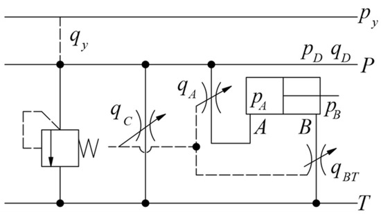In order to further analyze the characteristics of the system, taking the boom rising as an example, the schematic diagram of equivalent damping as shown in Figure 3 was obtained according to the structure and working principle of the multi-way valve. When the multi-way valve is in the speed regulation section, Port P is connected with Port A and Port T at the same time. The principle of speed regulation is by-pass throttling. The system flow is distributed according to the liquid resistance ratio of PA and PT channels through the Port P of the multi-way valve, and the liquid resistance of the PA, PT, and BT channels is a linkage relationship.