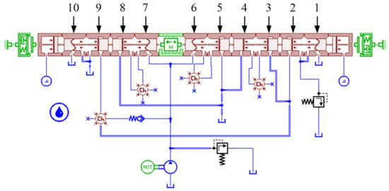 Since the throttle area of a valve spool is not only affected by the form of orifice, but also related to many factors such as the matching of the shaft and port and flow channel. It is very difficult to calculate in detail. At present, an empirical formula is widely used to simplify the calculation process. Some international companies even regard it as a technical secret, so it is difficult to obtain accurate performance parameters before and after improvement. Therefore, the accuracy of the model needs to be verified by some practical tests. Through structural mapping, the structural size of the valve spool is drawn, and the flow area formula of each valve port and the initial parameters of spring at the control end are calculated. An AMESim HCD (Hydraulic Component Design) simulation model was built, as shown in Figure 5. The relief valve was used to simulate the load pressure. The main parameters of each element in the simulation model were mainly set according to the actual structure mapping. Some key parameters are shown in Table 1.