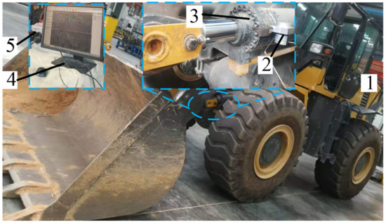 Loader test prototype. 1—Test prototype; 2—Displacement sensor; 3—Boom cylinder; 4—Monitor; 5—DEWETRON data acquisition instrument.