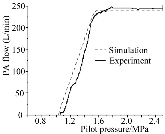 Since the calculated statistic F was less than the standard value, there was a 95% confidence that there was no significant difference between the simulation data and the test data. That is to say, the simulation data can predict the relationship between the flow rate through the PA port of the improved multi-way valve and the pilot pressure. At the same time, the actual test data also verifies the rationality and correctness of the simulation results, which can well reflect the actual characteristics and provide a basis for analysis.