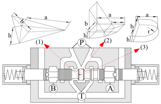 - Du, J.; Zhao, T.C. Analysis of throttle valve port structure and function. Hydraul. Pneum. 2010, 2, 52–54. [Google Scholar]