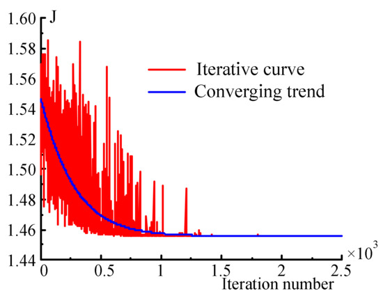 As shown in Figure 11, after 2500 iterations, the result of the triangular groove model basically converged. The ordinate is the value of the corresponding objective function, and the abscissa represents the iteration number. The optimal solution of the triangular groove valve port was a = 11 mm, b = 3.03 mm, h = 3.92 mm, and the underlap corresponding to zero displacement was 14 mm. Similarly, the optimal results of the U-shaped groove valve port were a = 8.9 mm, b = 2.24 mm, h = 1.22 mm, and the underlap corresponding to zero displacement was 11.9 mm. The optimization results of the L-shaped groove port were a = 9.6 mm, b = 2.23 mm, h = 1.02 mm, and the valve opening was 12.6 mm. A comparison table of the valve port parameters before and after optimization is shown in Table 5. The performance of the multi-way valve had obviously been improved.
