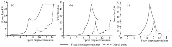 Power loss comparison between the fixed displacement pump and digital pump. (a) No load (3.3 MPa); (b) Medium load (12 MPa); (c) Heavy load (17 MPa).