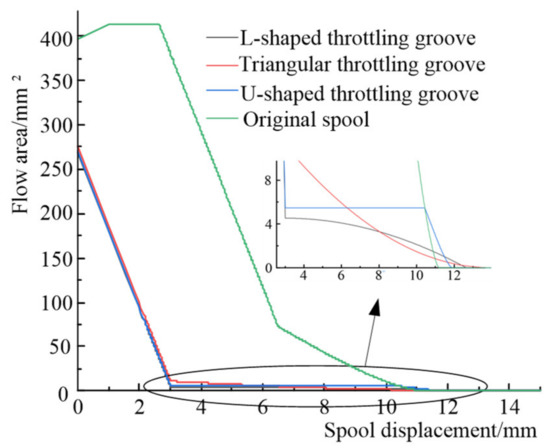 The optimized valve port parameters were input into the simulation model to compare the simulation effect before and after the optimization of a multi-way valve port. Before and after optimization, the curves between the flow area of the PT valve port and the displacement of the valve spool are shown in Figure 13. After optimization, the flow area of the PT port was greatly reduced, and a dead zone of about 3 mm was reserved to prevent the driver from mis-operation. Next, the three curves are explained separately. The triangular throttling groove valve port: with the increase of the spool displacement, the PT valve port flow area decreased slowly, so it was easy to adjust the flow and was beneficial to the stability of the control system. The L-shaped throttling groove valve port: the flow area changed slightly at the initial position of the spool displacement, at about 3~6 mm, which is beneficial to the stability of the flow at the execution end. With the increase in the spool displacement, the change rate of the flow area was large, which is conducive to the rapid response of the system. The U-shaped throttling groove valve port: when the spool displacement was in the position where the opening of the valve port was greater than the arc radius at the top of the throttling groove, about at 3–10.78 mm, the flow area changed smoothly and tended to be a constant value. As the spool displacement increased until the position where the opening of the valve port was greater than the arc radius at the top of the throttling groove, about at 10.78–11.9 mm, the gradient of the flow area change was larger than the others.