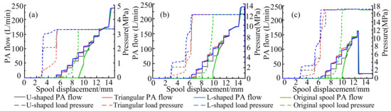 Curves of PA flow with respect to the spool displacement. (a) No load (3.3 MPa); (b) Medium load (12 MPa); (c) Heavy load (17 MPa).