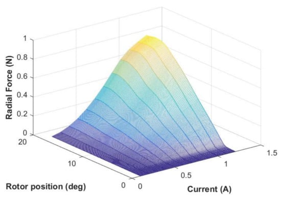 where Bn and Bt are the radial and tangential flux density, respectively. The first term represents the radial force distribution on the enclosing surface. The second term represents the circumferential component of the force distribution. In the FEA model, radial force calculation is integrated on the edge of stator pole tips to obtain the total force acting on each edge. In Figure 1, a radial force map of HR-SRM is provided with respect to rotor position and current.