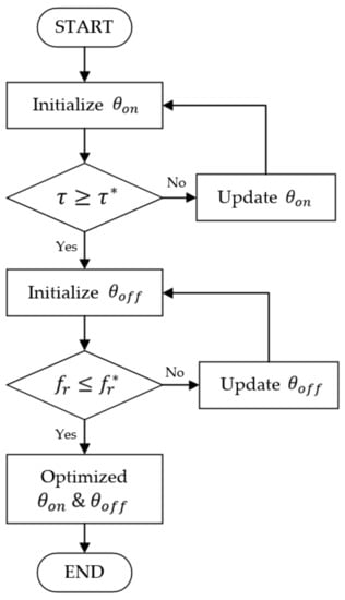 A phase advancing approach relies on the advance shifting of turn-on and turn-off angle to decrease the high radial attractive force () that occurs at the aligned position. A multi-optimization approach can be implemented such that, optimum search looks for the firing angle pair that minimizes the radial force, while keeping the average torque various in a small range. The optimization routine is presented in Figure 2; the angle is updated by 1° at each step to provide programmable results for hardware implementation. First turn-off angle () was fixed and by initializing a turn-on angle () by degree, optimization was carried out for turn-on angle to achieve the desired torque (). Once optimum was found, it was fixed at that value and search for optimum starts for minimum radial force. Highest vibration occurs at the commutation; therefore, in the proposed method, optimum turn-off angle is selected to minimize the radial force, while turn-on angle is selected to maximize the minimum torque.