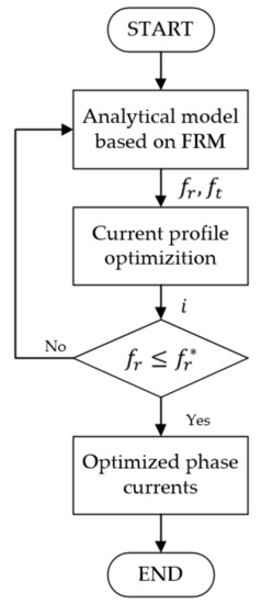 The computation of basic functions depends on a truncated Fourier series expansion for each point discretized on the contour. Higher resolution can be obtained with discretizing more points. The simulation process of the conventional field-based methods such as FEA is time consuming and has higher requirements on computer performance. Limited number of FEA magnetic field solutions are used to create the complete a magnetic model of the SRM for implementing FRM, which makes analysis more efficient, especially for the optimization process. The flowchart of optimizing current profile with FRM is shown in Figure 3. Since the model is semi-analytical, it can greatly save the computational cost for simulation, especially for electric machine optimization.