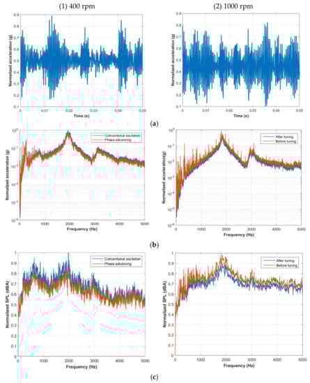 Based on the approach described in previous sections, optimized firing angles were imported to a look-up table in the experimental setup and programmed to the DSP, as shown in Figure 10. Vibration measurement from the accelerometer on the motor for time domain and frequency domain are shown in Figure 11a,b, respectively. Waveforms for sound pressure level is shown in Figure 11c and compared with results obtained from conventional excitation.