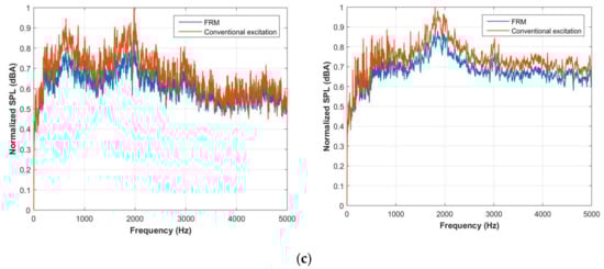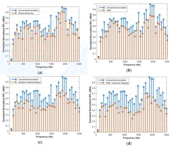 Acoustic noise profile from simulation at 400 rpm (a) phase advancing method; (b) FRM current shaping showing; (c) random hysteresis band; (d) RHB+SS excitation.