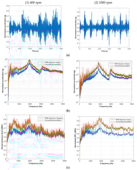 NVH plots for the RHB method; (a) Vibration profile (Time domain); (b) Vibration profile (Frequency domain); (c) Acoustic noise (Frequency domain).