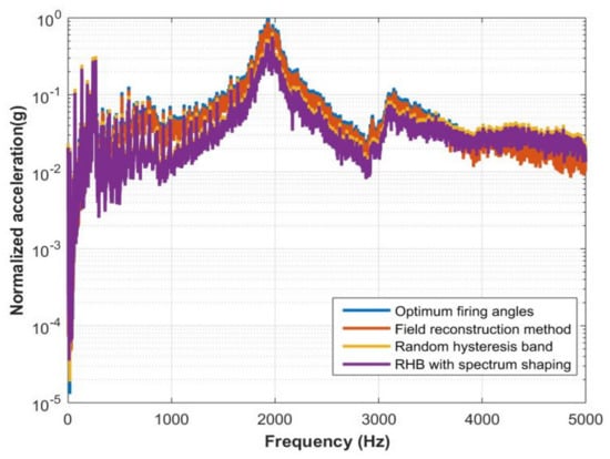 From this study, a random hysteresis band with spectrum shaping showed the best performance in reducing vibro-acoustic noise as we can see from Figure 19 and Figure 20. The phase advancing method showed high potential for reducing vibration and acoustic noise; however, it was limited in its ability to maintain the same output torque. This can be improved by adding current shaping to it, where in current shaping method based on field reconstruction provides higher reduction in noise. In order to replicate similar issues with experiments, the same output torque level was maintained during simulations. It must be noted that owing to this approximation, for further reduction or under different operation switching methodologies, performance could show further variation.