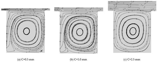 (a–c) The effect of changing the clearance (C) on the streamlines of the labyrinth seal under a pressure ratio of 2.