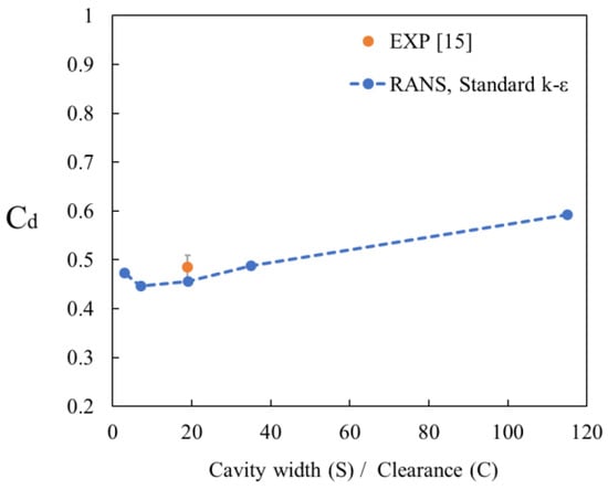 An increase in the clearance increased its cross-sectional area and increased the leakage flow rate, leading to a larger portion of the fluid directly flowing into the next cavity without dissipating its kinetic energy. As the Reynolds number increased, the jet divergence angle decreased, thereby increasing the leakage flow rate and the discharge coefficient. When the clearance increased, more fluid could pass through without being affected by the teeth, thereby decreasing the sealing effectiveness. However, the clearance should not be less than a certain value so as to avoid damage to the seal caused by thermal expansion of the material or friction when the clearance is too small. As shown in Figure 8, when the clearance was increased and the other geometrical parameters were kept constant under the same pressure ratio, the discharge coefficient increased. When the clearances were 0.5, 1.0, and 2.5 mm, the differences between the discharge coefficients predicted by RANS and the experimental data were approximately 4%, 6%, and 4%, respectively. Figure 8 also illustrates that when the pressure ratio was increased from 1.1 to 2, the discharge coefficients increased, because the higher pressure head was transferred to the higher kinetic energy of the fluid flow, and the velocity of the flow increased, thereby leading to increases in the leakage flow rate and the discharge coefficients.