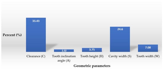 Based on the results in Section 4.1, Section 4.2, Section 4.3, Section 4.4 and Section 4.5, the sensitivities of the geometrical parameters (clearance; tooth inclination angle, height, and width; and cavity width) toward changing the discharge coefficient were calculated as percentages. The sensitivity for each parameter was calculated when the values of the other parameters were fixed. The calculated value for each parameter represents the maximum rate of change of the discharge coefficient when the parameter was changed, and the axial length was fixed. As illustrated in Figure 18, the most effective geometrical parameter for decreasing the discharge coefficient was the clearance, while the secondary most effective parameter for improving the sealing performance was the cavity width, which is closely related to the number of cavities, because reducing the cavity width for a fixed axial length requires more cavities. Furthermore, the third most effective parameter for decreasing the leakage flow rate was the tooth width, although decreasing the cavity width and increasing the number of cavities was actually more effective. Meanwhile, changing the tooth inclination angle and the tooth height was not as effective at increasing the sealing performance as changing the other parameters.
