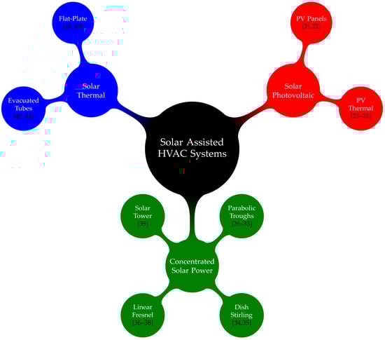Types of solar-assisted HVAC systems for buildings [,,,,,,,,,,,,,,,,,,,,,,,,,,,,].