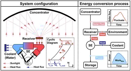 System diagram of solar dish Stirling engine showing its components and the Stirling thermodynamic cycle (left); and energy conversion process showing the flow of energy and its conversion in through the system (right). (Reprinted from [] with permission of Elsevier).