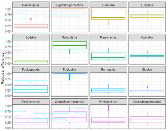 | Voivodeships | Relative Efficiency | 95% interval | ||