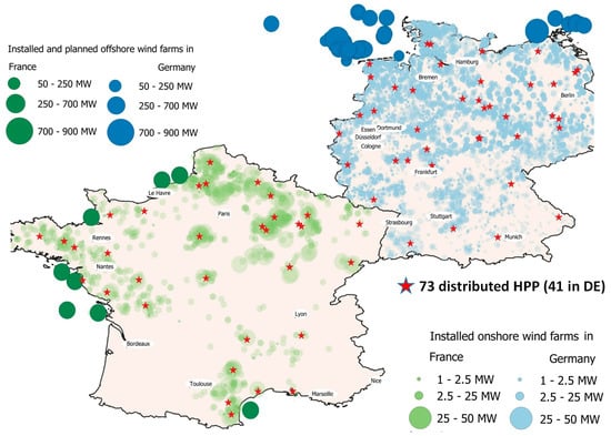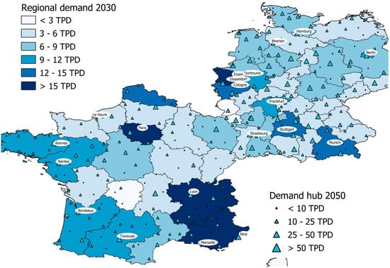Figure 2 shows both scenarios, represented by regional demand for the year 2030 (at low penetration rate) and the distribution location and capacities for the year 2050 (at high penetration share).