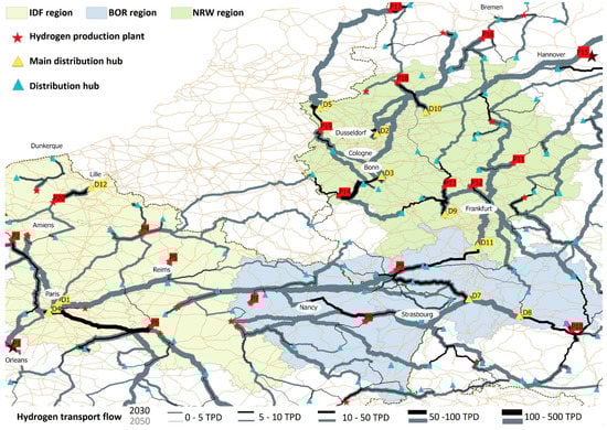 Figure 3). By 2050, the demand exceeds the regional production capacity, and hydrogen has to be exported from the production plant P17 in the north of Germany and from P15 and P16 located in east Germany. Moreover, the increase of the demand at the border also pushes the hydrogen to flow from north and east to south and west; thus, D11 is no longer exporting hydrogen from the south of Germany.