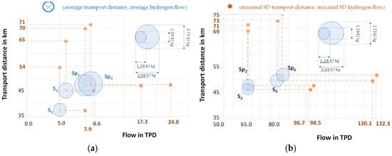 Figure 4a), the maximum transport distance SD varies with the number of the hydrogen production plants, as the lowest maximum SD of 54 km corresponds to the scenario with the highest HPP